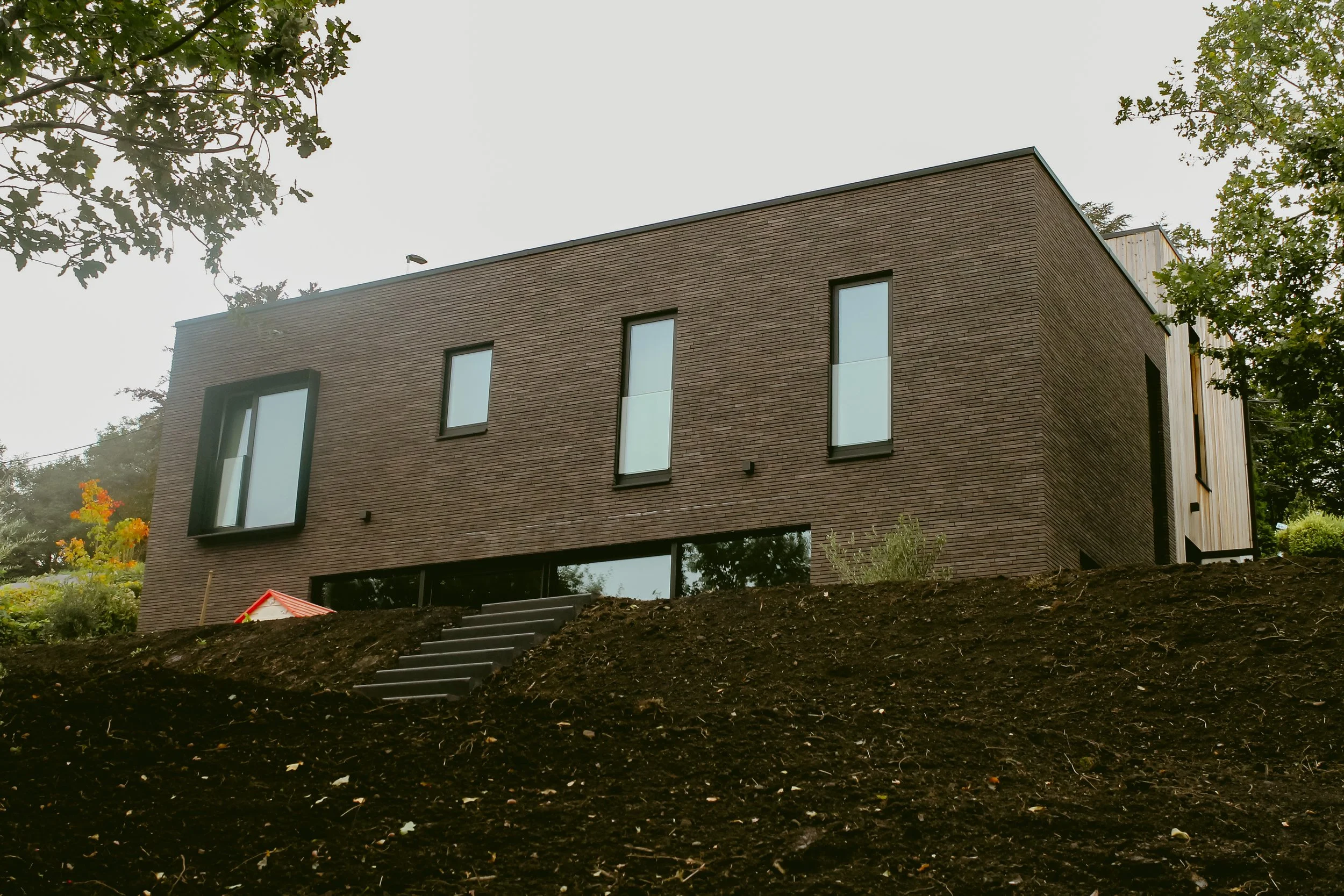 La maison se fond naturellement dans le relief en forte déclivité, s'effaçant pour mieux laisser place à la nature environnante. À hauteur de la rue, un hall d’entrée lumineux et généreux accueille les visiteurs et mène vers un espace professionnel distinct.